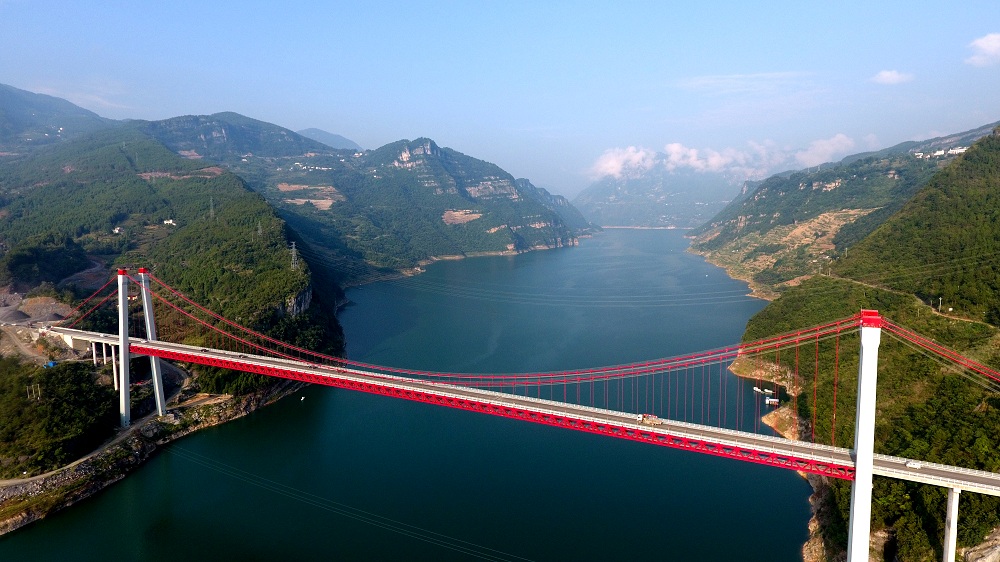 湖北水布垭清江特大桥,全长560米,主桥为420米单跨双铰钢桁梁悬索桥,全桥钢桁梁共35节,单节截面尺寸为12米×13.7米×4米,最大重量为65吨,主塔高101.5米,采用A字形钢筋混凝土框架结构。该桥地处鄂西深山峡谷区域,坐落于水布垭电站库区,下游200米为旅游码头,集两岸人民通行和观光旅游为一体。